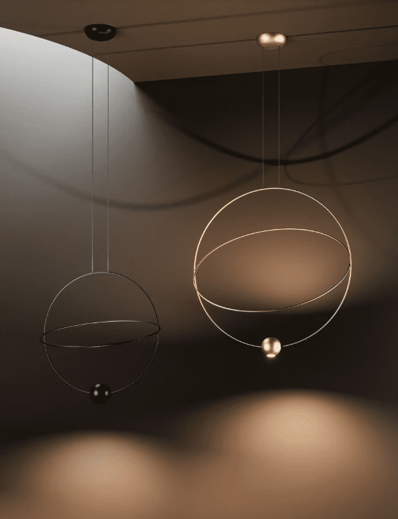 Named after Elara, blending astronomy and Greek mythology, this lamp’s geometric design mimics planetary trajectories. With adjustable metal rings and a central sphere housing the light source, users can experiment with angles and heights for varied illumination and shadow effects. Emitting a radiant glow, the lamp offers versatility even when turned off, allowing users to direct light as needed.