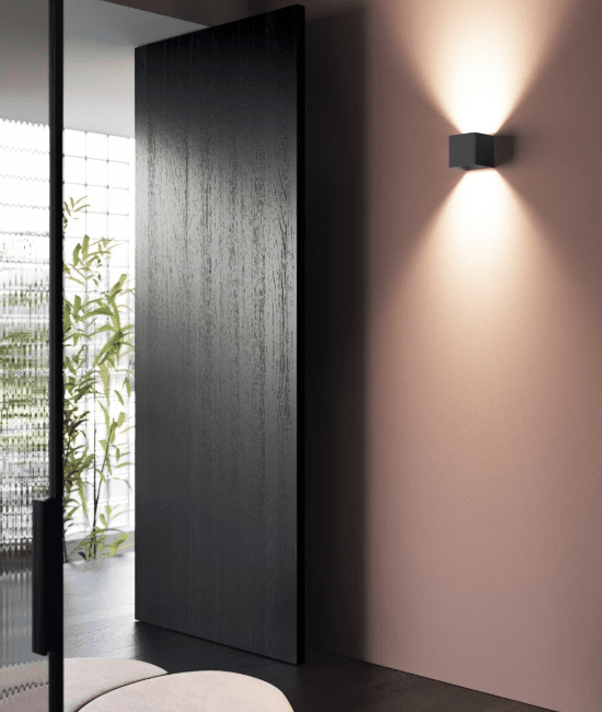 Laser is a compact box-shaped light fixture with a sleek architectural design. Its painted steel structure comes in three finishes, housing an LED source that creates captivating light and shadow effects on the wall.